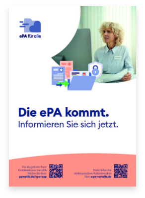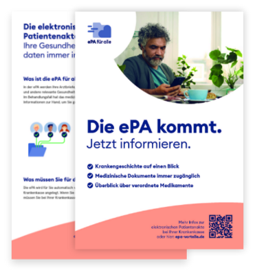 bestellen Sie zum Start der neuen ePA das Infopaket mit Plakaten und Flyern und unterstützen Sie Ihre Patientinnen und Patienten dabei, ihre Gesundheitsdaten sicher und effizient zu verwalten.