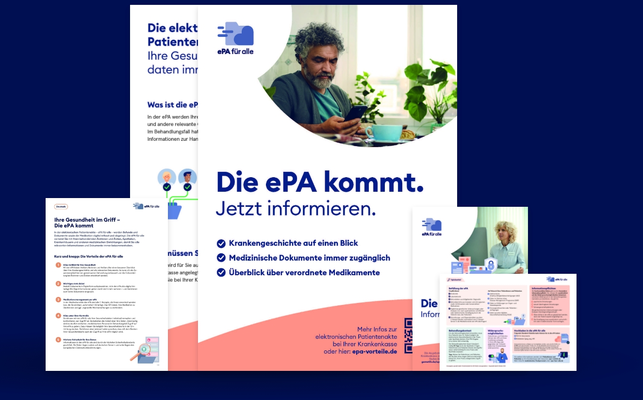 Mit diesen kompakten Materialien erhalten Sie alle notwendigen Informationen, um Ihre Patientinnen und Patienten umfassend und verständlich über die Vorteile und die Nutzung der ePA für alle aufzuklären.