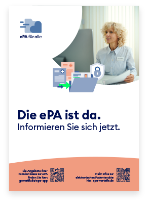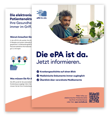 bestellen Sie zum Start der neuen ePA das Infopaket mit Plakaten und Flyern und unterstützen Sie Ihre Patientinnen und Patienten dabei, ihre Gesundheitsdaten sicher und effizient zu verwalten.